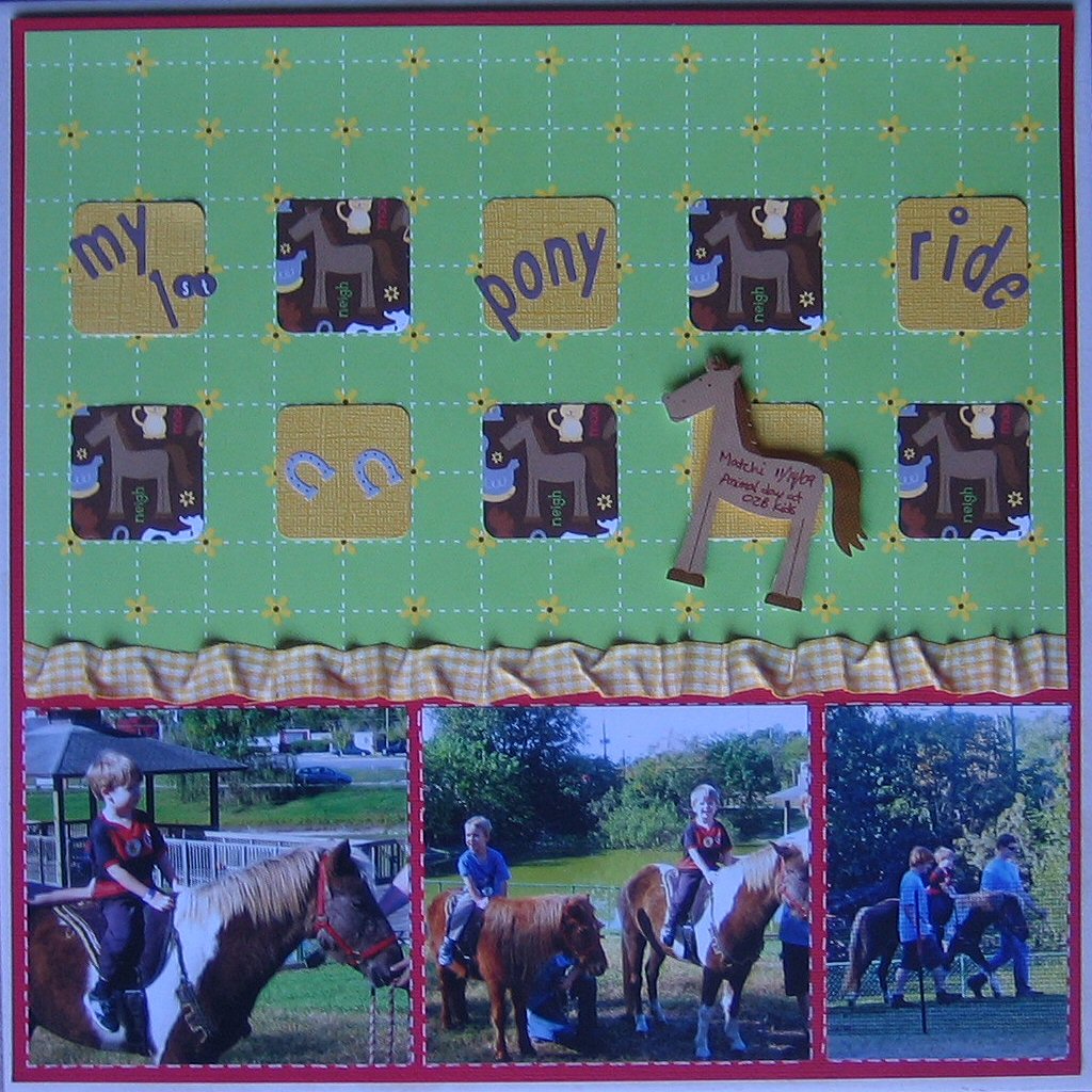I used Doodlebug - Barnyard - papers and stickers from an Apron Strings Soup for One. I added fabric tape from Love My Tapes and Pink Paislee cardstock alphabets - chocolate whimsies. American Craft (red) and Core'dinations (yellow) cardstock. This LO was based on the Creative Scrapers sketch # 140: